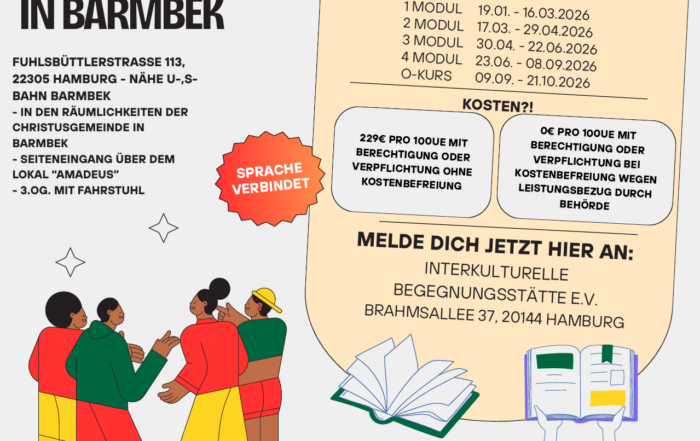 Die Interkulturelle Begegnungsstätte bietet in den Stadtteilen Eimsbüttel und St. Pauli Integrationskurse an. Diese werden vom Bundesamt für Migration und Flüchtlinge (BAMF) gefördert. Die Kurse finden vormittags oder abends von Montag bis Donnerstag statt. Vereinbaren Sie einen Termin in der Lernberatung.